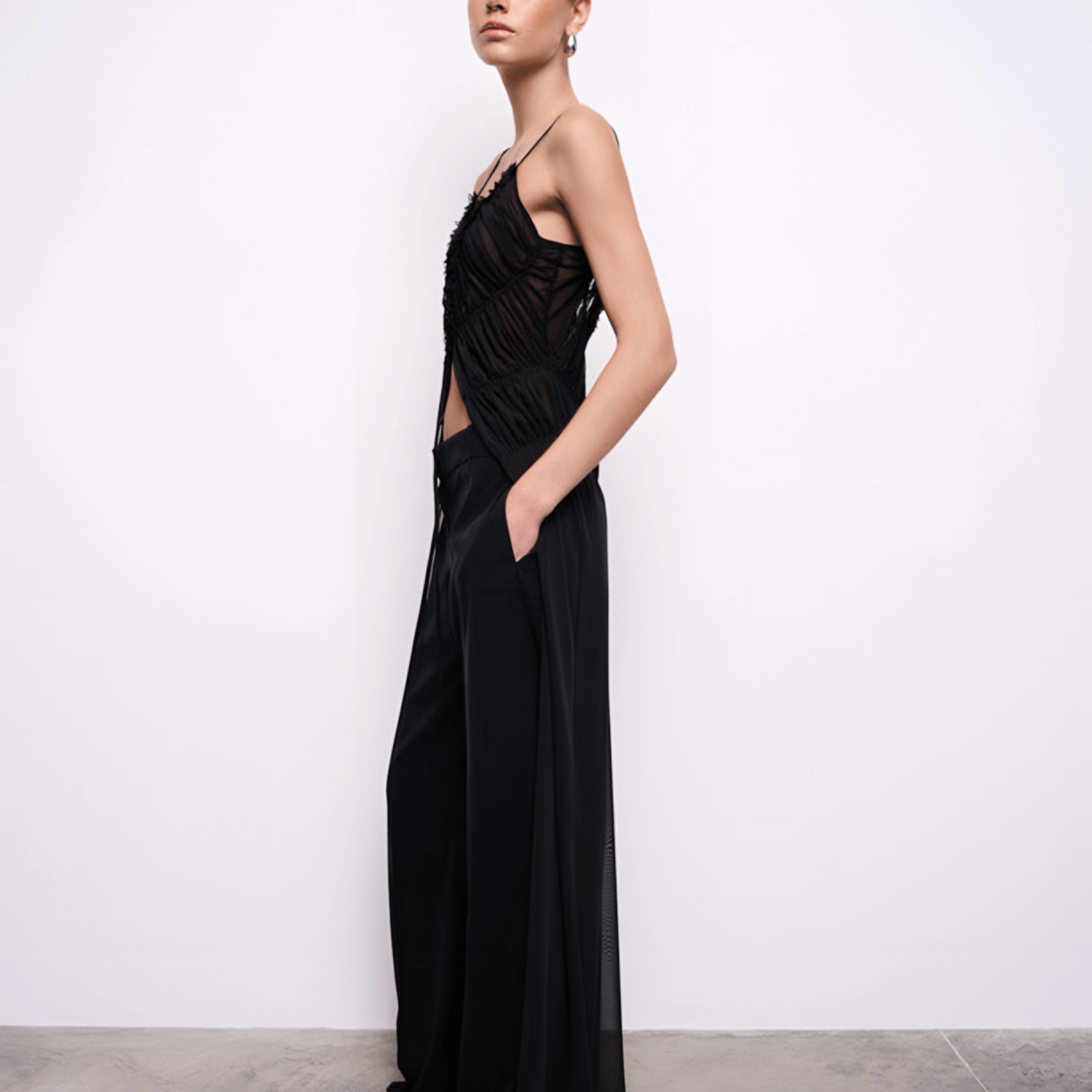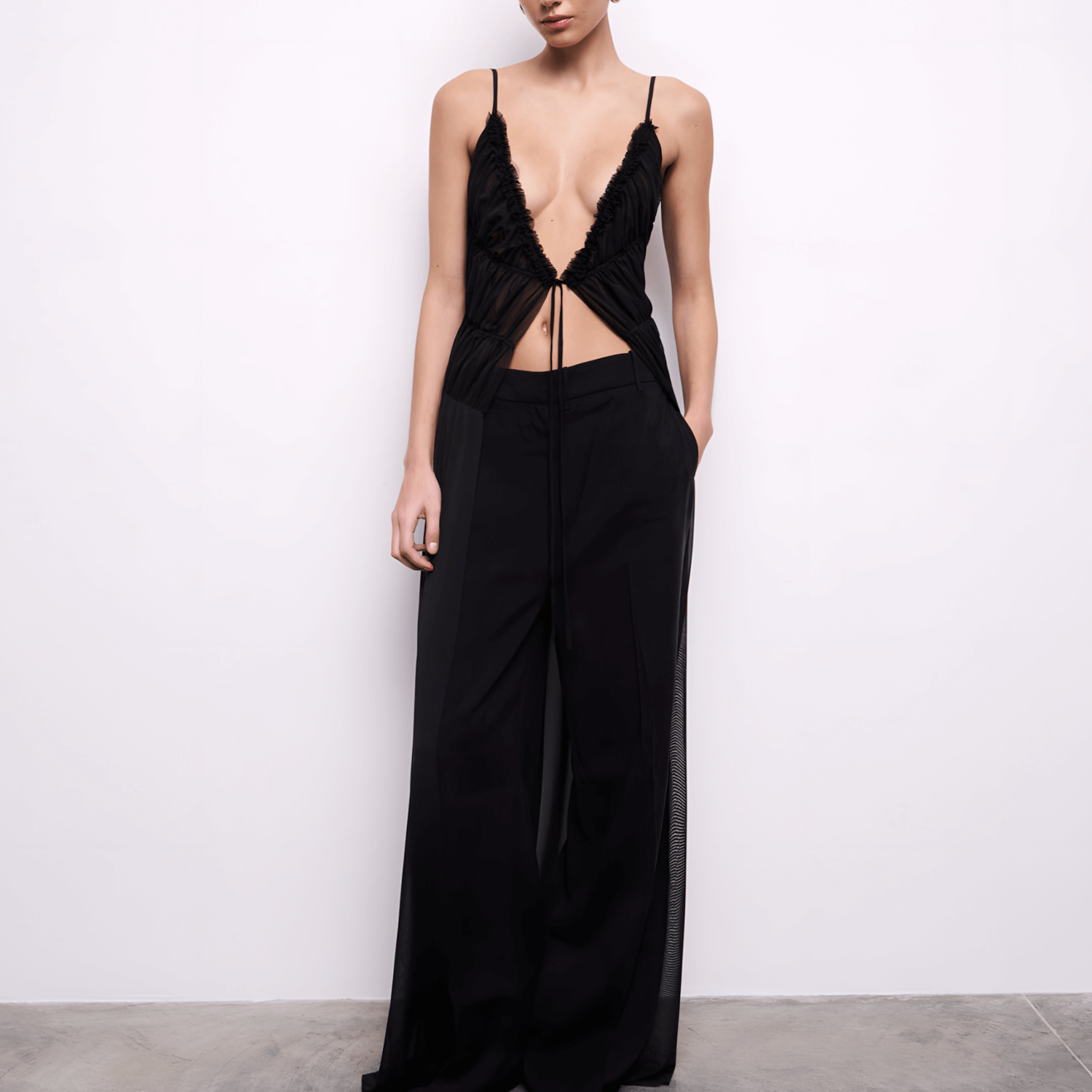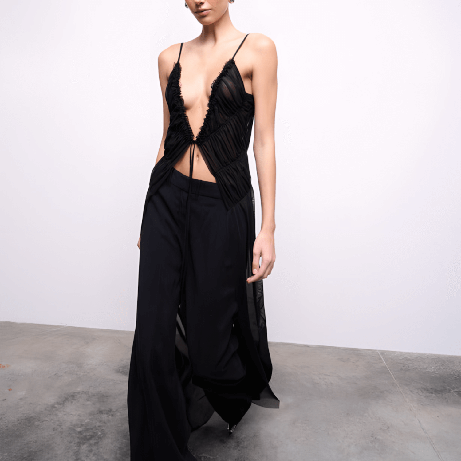 Deep V-neck top with ruched detail. Features adjustable thin straps, moderately sheer fabric, a front tie closure, and delicate stitching.