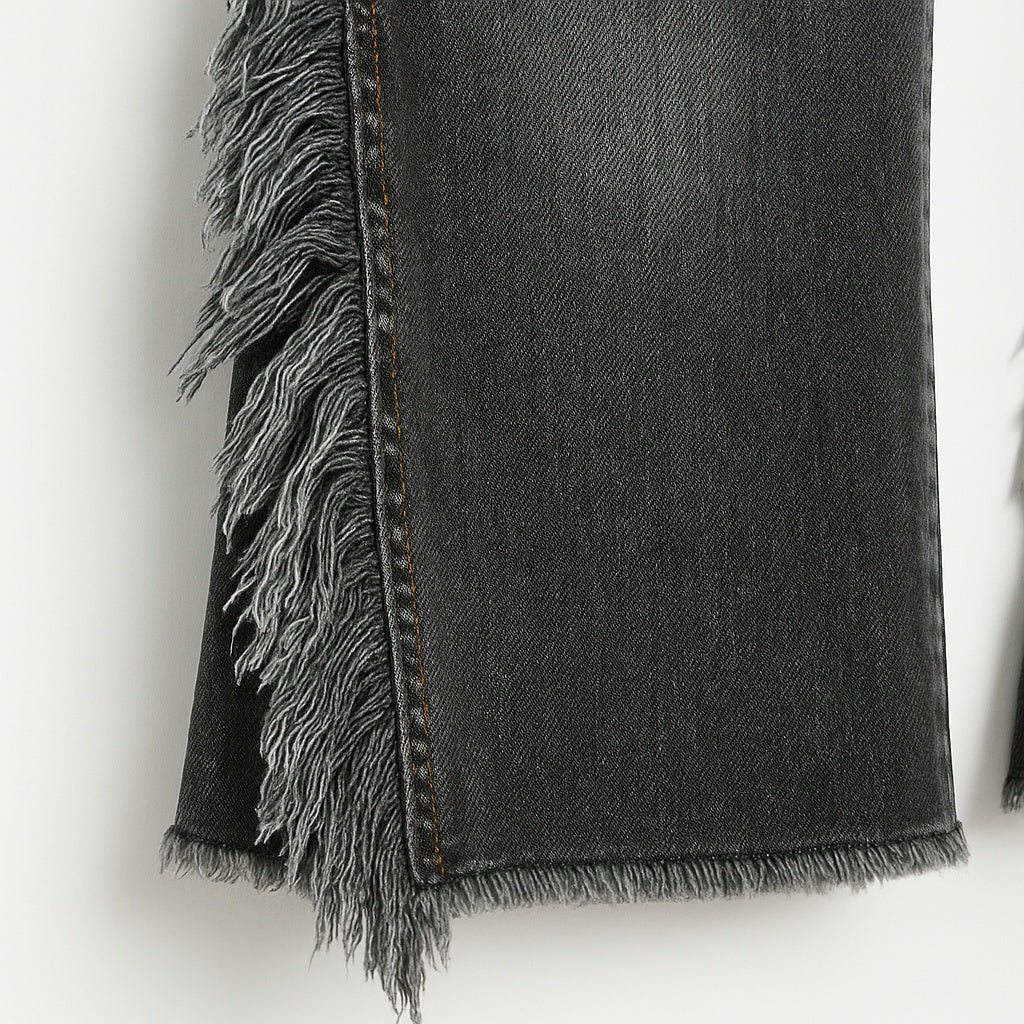 High-waisted flare pants. Black jeans with soft wash and satin finish. Long fringe applied on the sides of the legs. Front and back pockets with contrasting stitching. Front closure with zipper and metal button.